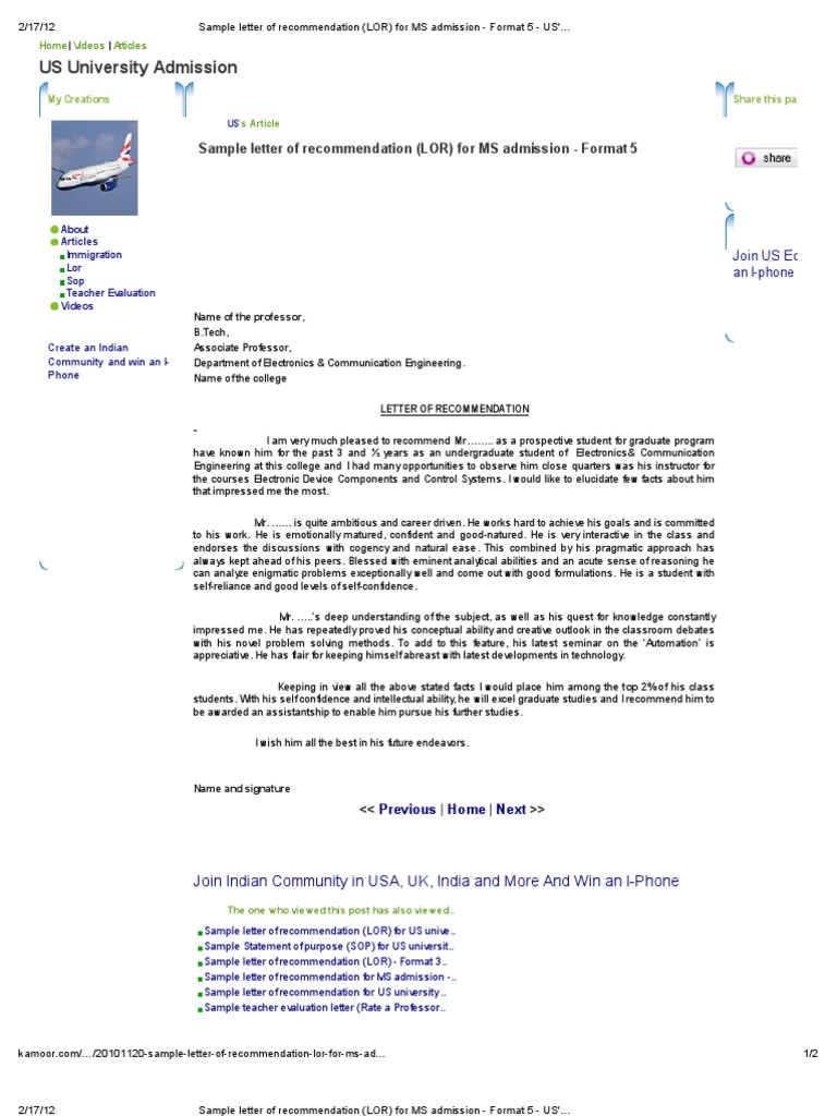 Sample Letter of Recommendation (LOR) for MS Admission ...