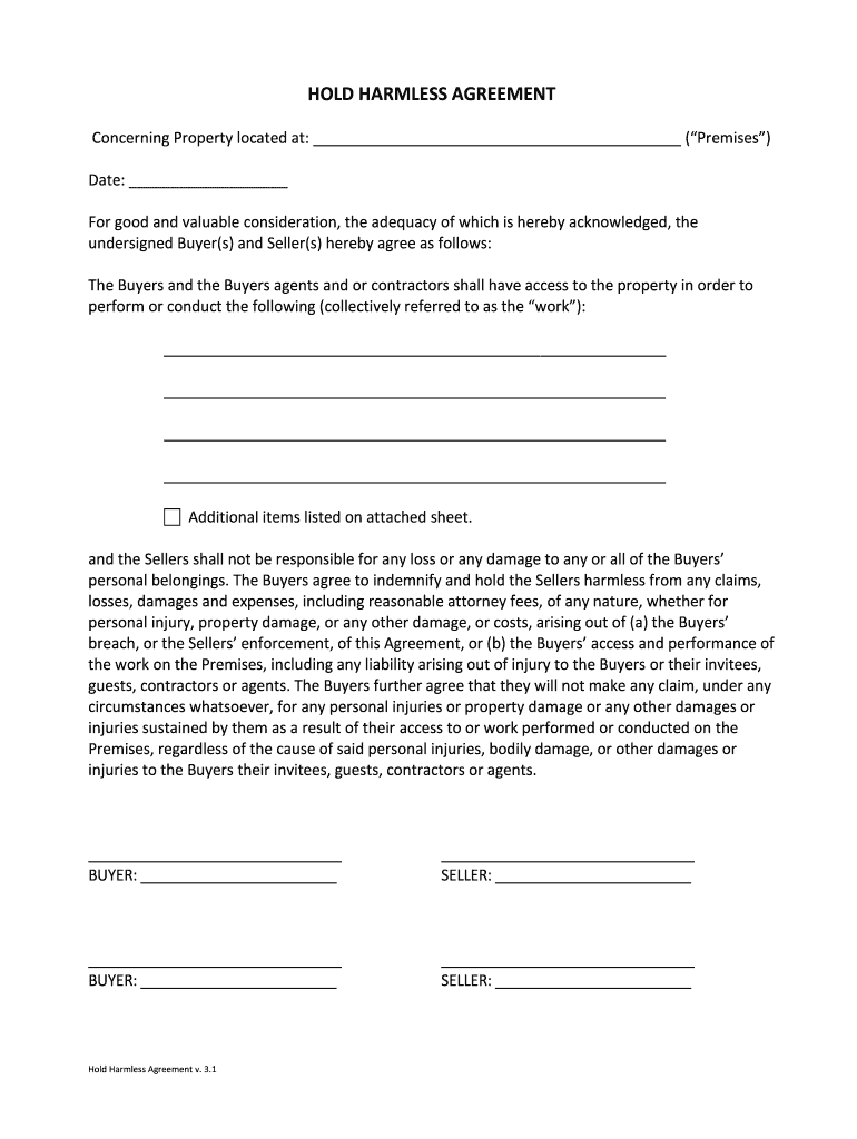Free Legal Forms Hold Harmless Agreement. Download free hold harmless agreement template and hold harmless agreement form from our website. Here are some professional-grade samples of hold harmless contracts used in a variety of situations, provided as PDF and Word document files.